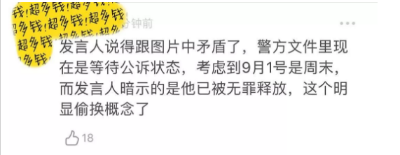 警方文件里因为考虑到周末的原因,所以是等待公诉状态,而发言人却暗示刘强东被无罪释放,明显是偷换概念。