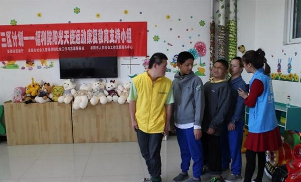 2018年4月19日,“三区计划”项目社工为阜阳市社会儿童福利院的孩子们开展了第五节阳光天使运动康复教育支持小组活动,这也是本次运动康复教育支持小组的最后一次活动。孤残儿童运动康复教育支持小组为组员创造了一个面对面的密切沟通的环境,组员们在这样一个环境中认识自我与他人,激发了组员们的运动能力。