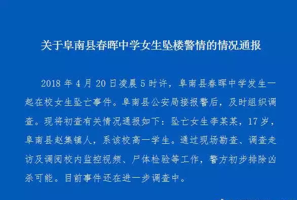 2018年4月20日凌晨5时许,阜南县春晖中学发生一起在校女生坠亡事件。阜南县公安局接报警后,及时组织调查。现将初查有关情况通报如下:坠亡女生李某某,17岁,阜南县赵集镇人,系该校高一学生。通过现场勘查、调查走访及调阅校内监控视频、尸体检验等工作,警方初步排除凶杀可能。目前事件还在进一步调查中。