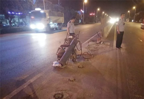 让民警没想到的是,就在民警驱车准备将损毁交通设施的钱某某移交给交警大队时,两公里外的另一个段公路中间,两名男子挥舞着锤子、钢棍等工具,正在砸路中间的隔离栏杆。