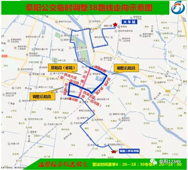 1、线路具体走向:火车站原线至—河滨路—京九路—西湖大道(原:一道河路)—颍上路—淮河路—新安路(原:新安大道)—至原线。