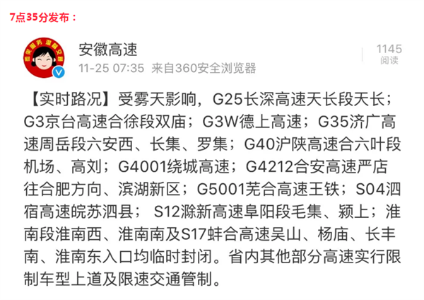 大雾黄色预警阜阳市气象台2018年11月25日02时52分发布大雾黄色预警信号。目前高速公路阜阳南路口和太和、界首、临泉部分路段能见度已经低于500米,出现大雾;预计未来12小时内我市大部分地区将出现